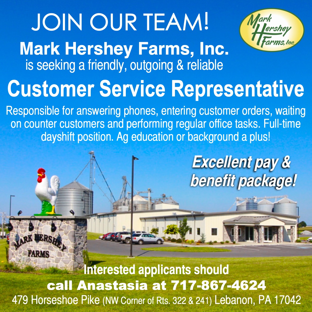 Customer Service Representative: Full-Time, Mark Hershey Farms, Lebanon, PA (posted on Sept. 25, 2024)