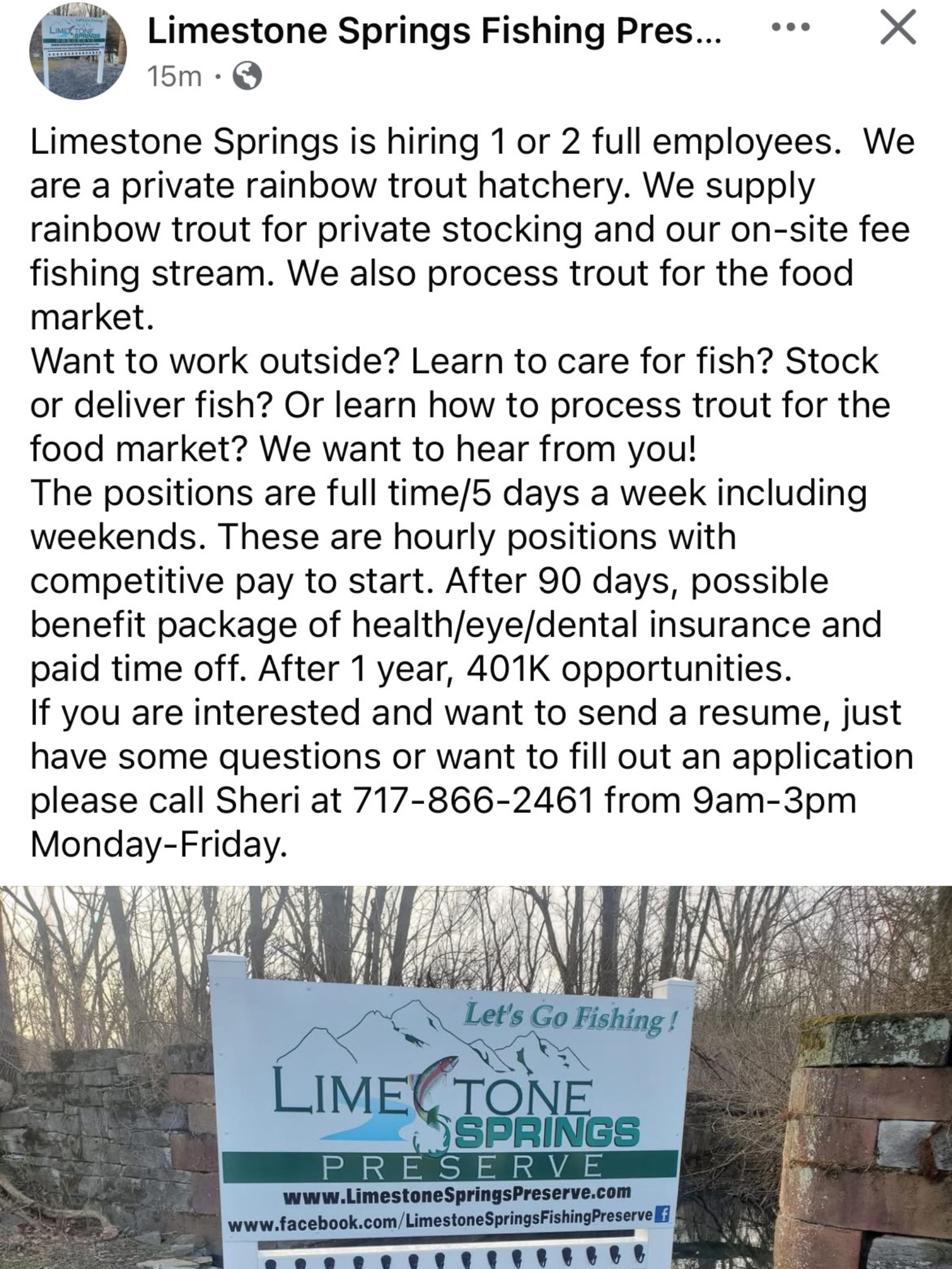 Fish Farm Worker: Full-Time, Limestone Springs Fishing Preserve, Richland, PA (posted on March 21, 2025)